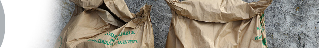Les déchets de jardins : tontes de pelouse, feuilles d'arbre et fleurs fanées contenues dans des sacs en papier "OK compost" ; tailles de haies et d'arbustes liées en fagots d'1 m de long et 50 cm de diamètre maximum (fil de fer interdit).