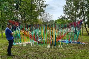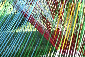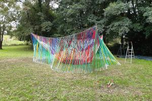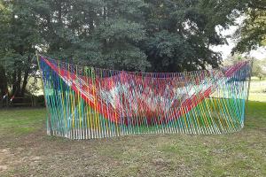 Océan clément ? De la palpitation répétitive au rugissement soudain, de la lune dans l’obscurité à la clarté foudroyante, Verlaine associe avec maestria dans ses Poèmes Saturniens les perceptions sonores et visuelles entre mouvement cyclique et surgissement brutal. La proposition du jeu, duel entre nature paisible et terrifiante, charpente l’œuvre aux couleurs chatoyantes. Les rubans tendus de la forme enveloppante, aux dessins et couleurs paisibles évoquant mer et ciel, laissent transparaître dans leurs intervalles ceux de la forme intérieure aux dessins aigus et couleurs rouges du danger. Pour vivre pleinement l’expérience, l’activation de la musique (QR code) mêlant sons naturels et mots du poème, amplifie l’immersion et développe la poétique de l’installation. Préparez vos casques ou oreillettes...