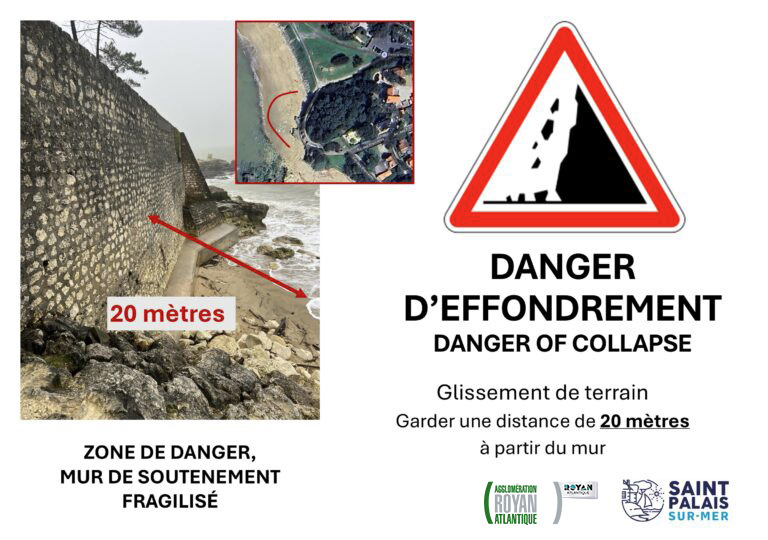 Compétente en matière de lutte contre l'érosion, la CARA intervient au titre de l'urgence de la situation, en partenariat avec la commune de Saint‑Palais‑sur‑Mer, pour assurer la sécurité des usagers.